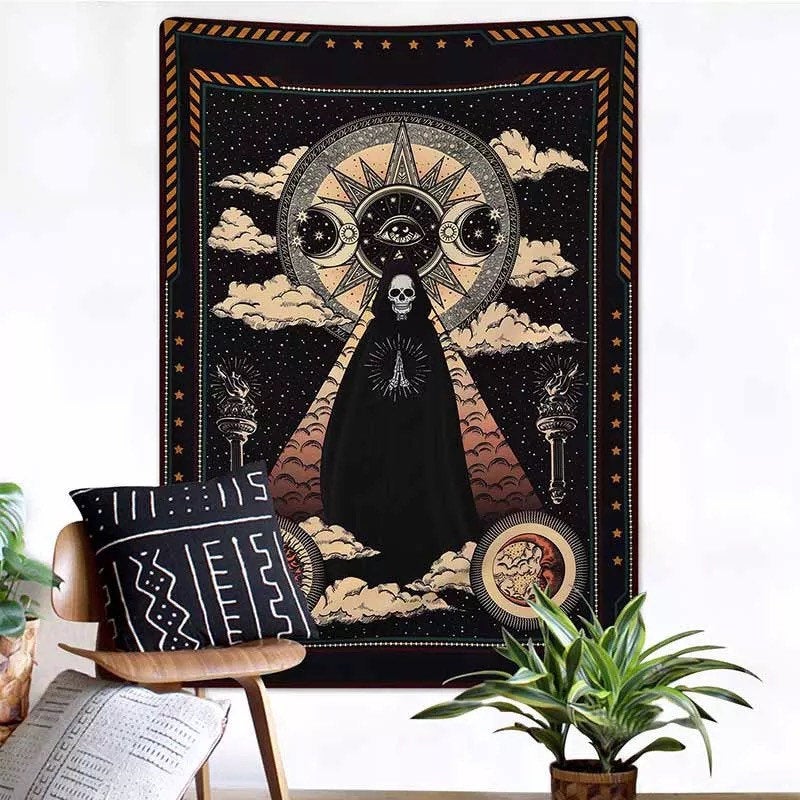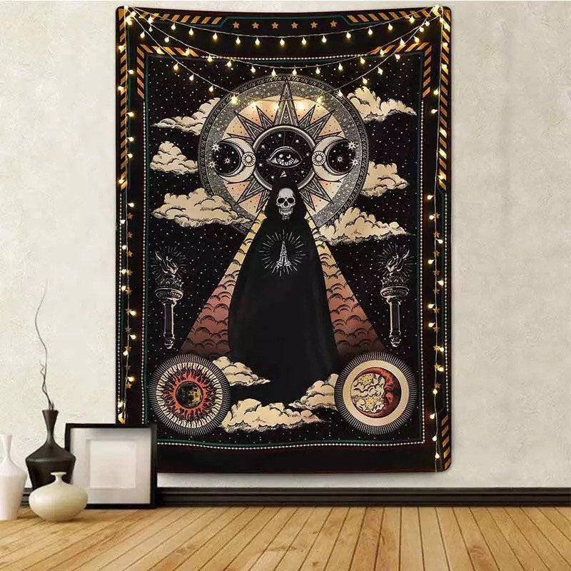 Bring Pagan Gothic Vibes into your space with this beautiful Skeleton Moon Wall Tapestry